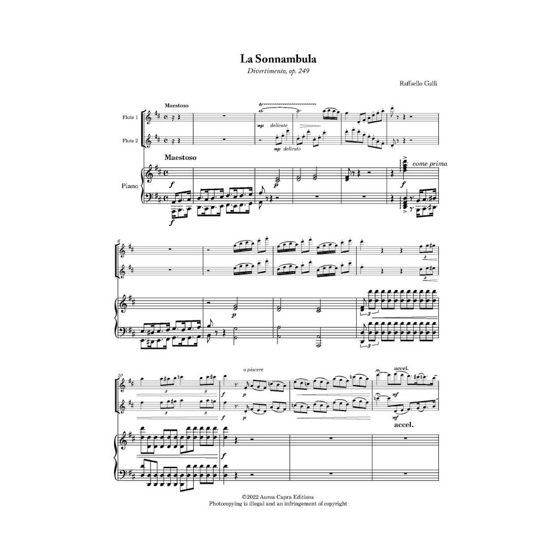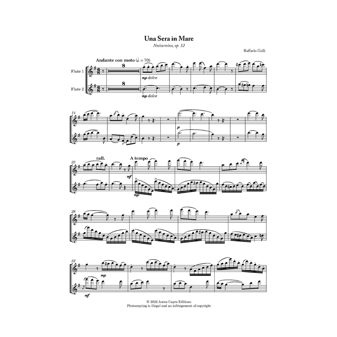 Two newly discovered pieces for two flutes and piano by Raffaello Galli. Galli, who was principal flute at La Scala Milan, wrote around 400 works for flute, most of which have been long since lost. This carefully revised edition revives two of the most charming of these forgotten works: Una Sera in Mare, which combines virtuoso passage work for both players with delightful Neapolitan style melodies; and La Sonnambula, a fantasy on melodies from Bellini’s opera. A sparkling addition to the repertoire and an ideal concert alternative to the better known Doppler duos.
