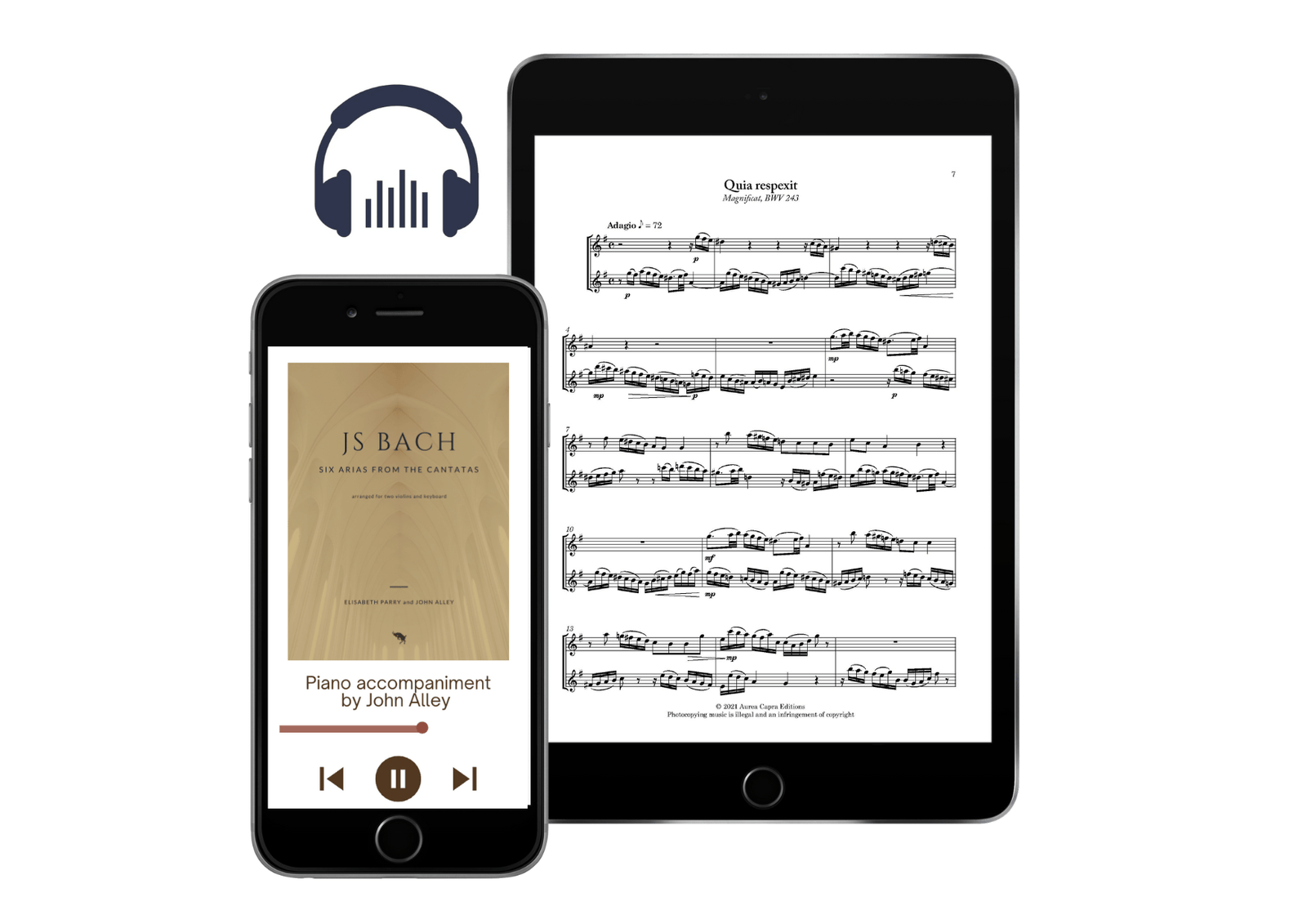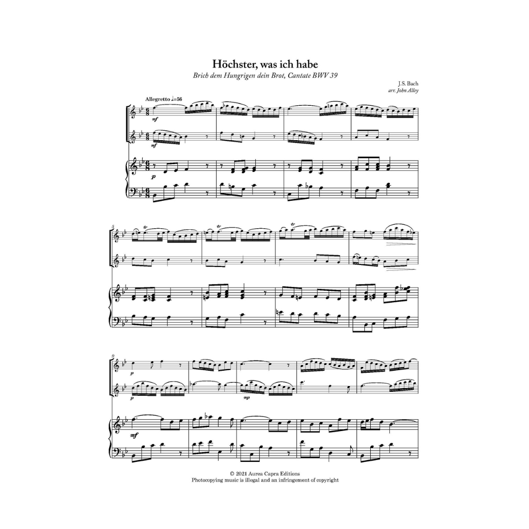 Bach cantatas for violin. Six obbligato arias from Bach cantatas, beautifully arranged for two violins and piano. Ideal for concert or worship performance. Carefully edited with historically-appropriate articulation, dynamics and cadential trills.